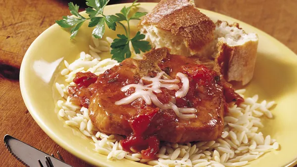Step5Before serving, remove toothpicks from pork chops. Brush chops with warm barbecue sauce; garnish with green onion. Serve with mashed potatoes.