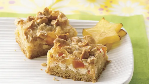 Step3Sprinkle cashews over crust. Pour cooked mixture over cashews; spread evenly. Bake 15 to 20 minutes or until light brown and set. Cool completely, about 1 hour. For bars, cut into 10 rows by 6 rows.