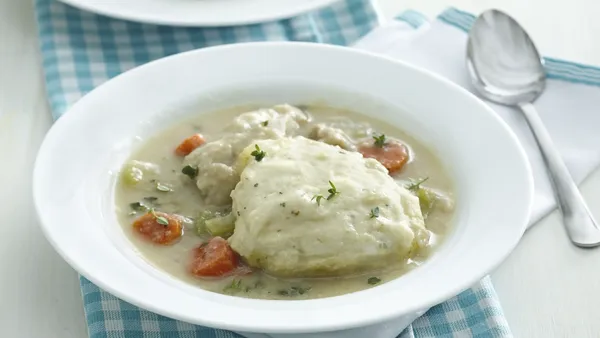 Step4In medium bowl, stir remaining 2 cups Bisquick™ mix and the milk with wire whisk or fork until soft dough forms. Drop dough by spoonfuls onto hot chicken mixture (do not drop directly into liquid). Cook uncovered over low heat 10 minutes. Cover and cook 10 minutes longer.