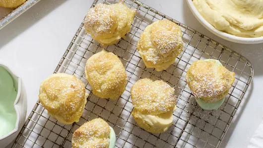 Cut off the top third of each puff and pull out any strands of soft dough. Prepare filling(s) and fill the cream puffs as directly below.
