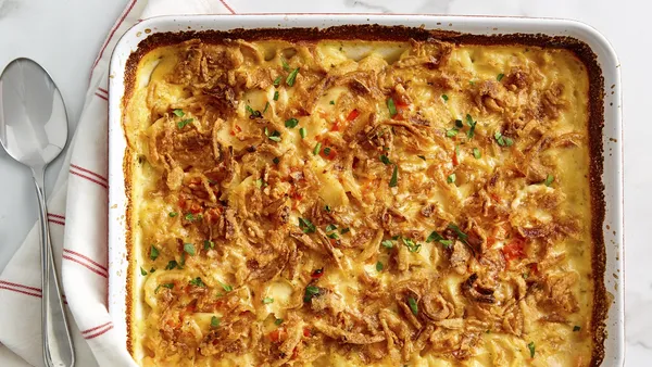 Step2Make potatoes as directed on box for stove-top directions. Stir in sour cream dip. Pour mixture into baking dish. Top with onions.