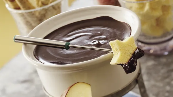 Step2Arrange cake and fruit dippers on platter. Set fondue pot in center of platter.