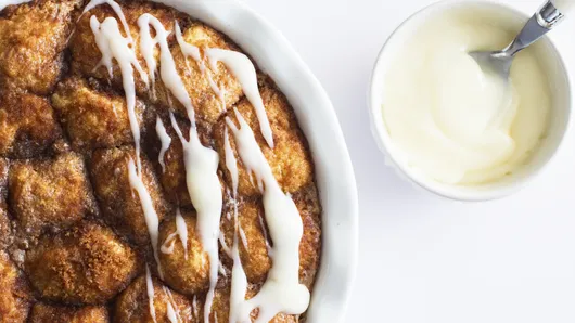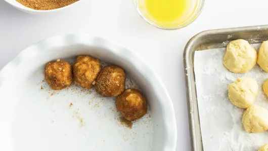 Roll the dough portions into balls. Roll the balls in the melted butter and then roll in the cinnamon mixture. Place the dough balls close together in the baking dish.