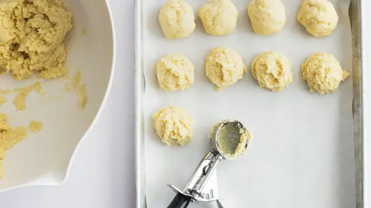 Scoop dough into rounded tablespoon portions and place on a parchment paper-lined baking sheet.