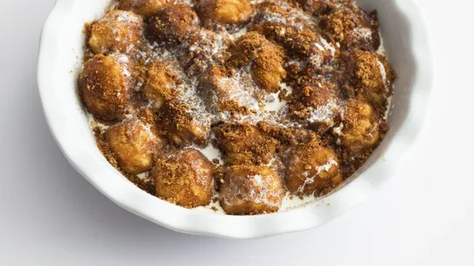 Once the coated dough balls are in the pie plate, pour some heavy cream over the top for a little extra richness, and bake until golden and fragrant.