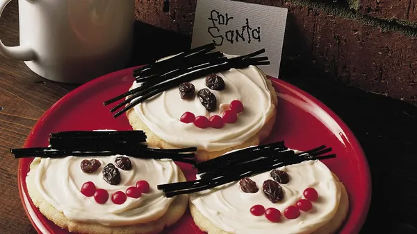 Step3Frost and decorate 1 cookie at a time. After spreading frosting on cookie, add licorice for band of earmuffs and candies for ear "covers" and snowman face.