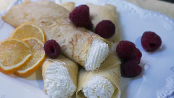 Step3To assemble each crepe, spoon about 1/4 cup of the filling on one end of crepe; top with 5 raspberries. Roll up; sprinkle each crepe with powdered sugar. Serve with additional raspberries.