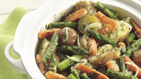 Step4Add asparagus to potatoes in grill basket. Cook about 10 minutes longer or until potatoes and asparagus are tender, shaking basket occasionally to turn and mix vegetables.