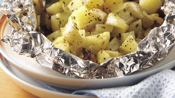 Step3Bring up 2 sides of foil so edges meet. Seal edges, making tight 1/2-inch fold; fold again, allowing space for heat circulation and expansion. Fold other sides to seal.