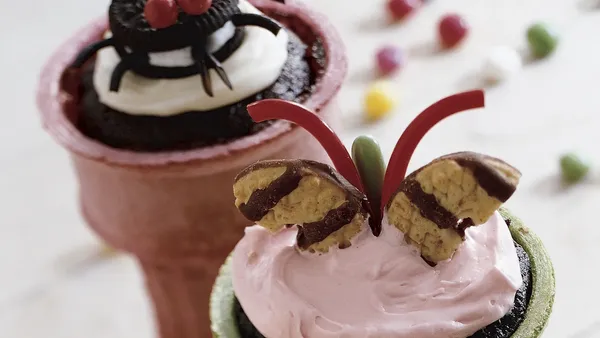 Carefully remove paper baking cups. Generously frost each cake with frosting and decorate as desired. Store loosely covered at room temperature.