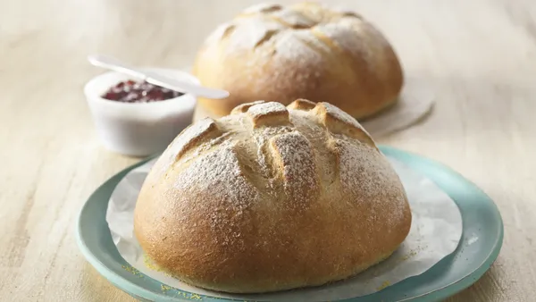 Step5Heat oven to 375°F. Place 8- or 9-inch pan on bottom rack of oven; add hot water until about 1/2 inch from top. Uncover dough; using serrated knife, carefully slash tic-tac-toe pattern on each loaf top. Bake 15 to 20 minutes or until loaves are dark golden brown and bread sounds hollow when tapped. Remove from cookie sheet to cooling rack; cool.