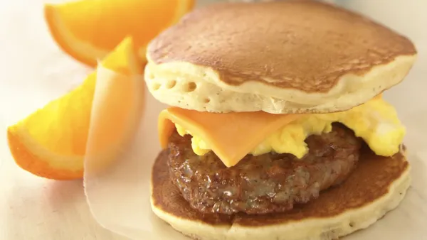 Step4To assemble each panwich, top 1 pancake with egg wedge, bacon slice and another pancake.