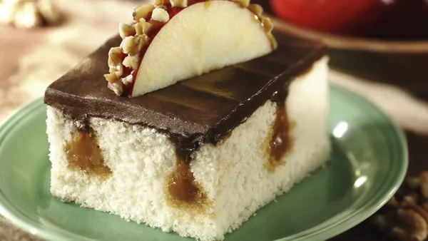 Step4Meanwhile, in small bowl, mix 1/4 cup of the caramel sauce and the sea salt. Poke warm cake every inch with a straw or handle of wooden spoon, halfway into cake. Pour caramel-salt mixture over cake, allowing it to fill in holes.