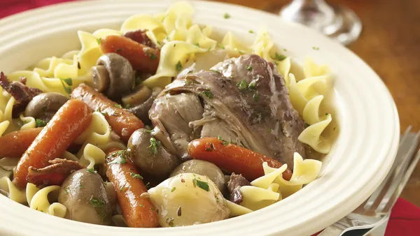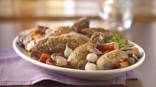 You've got the skills to create this skillet coq au vin for two! It's a special, gourmet meal that's also a down-home and hearty dish. Coq au vin–chicken sautéed and then simmered in a rich red wine-and-mushroom sauce—is a classic that every cook can make. Because why not? We’ve sized it just right for two diners, so you can bring a little bit of French bistro cooking to your kitchen without too much fuss (or too many leftovers). Bring this taste of French flair to the table any time you want to make an impression! Your guests will all scream "oui oui!" for this one!