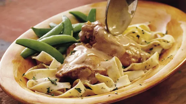 This chicken dish uses distinctive Hungarian ingredients, including paprika and sour cream, for a creamy stew served with mashed potatoes.