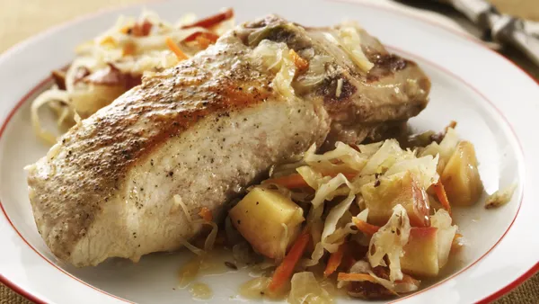 Step1In 12-inch skillet, cook bacon over medium-high heat, stirring occasionally, until crisp. Remove bacon from skillet to large bowl; reserve drippings in skillet. Sprinkle both sides of ribs with salt and pepper; cook in drippings until browned. Meanwhile, stir cabbage, apples and onion into bacon in bowl.