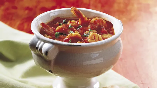 Ladle out big bowlfuls of his hearty soup, packed with fresh fish and shrimp, plus easy canned crab and clams and a bounty of vegetables.
