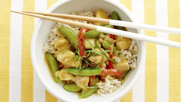 Glam up basic sugar snap peas by sautéing this classic veggie with onion and garlic, then blending in thyme-flavored rice.