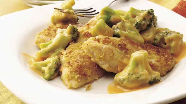 Step2Combine soup and sour cream. Pour soup mixture over broccoli and turkey. Sprinkle with cheese and bread crumbs.