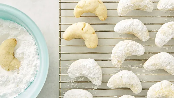 Step3Shape dough into 40 (2-inch) logs; bend logs to form crescent shape. Place crescents 2 inches apart on cookie sheets. Bake 12 minutes or until edges are light golden brown. Remove from cookie sheets to cooling racks; sprinkle cookies with powdered sugar.